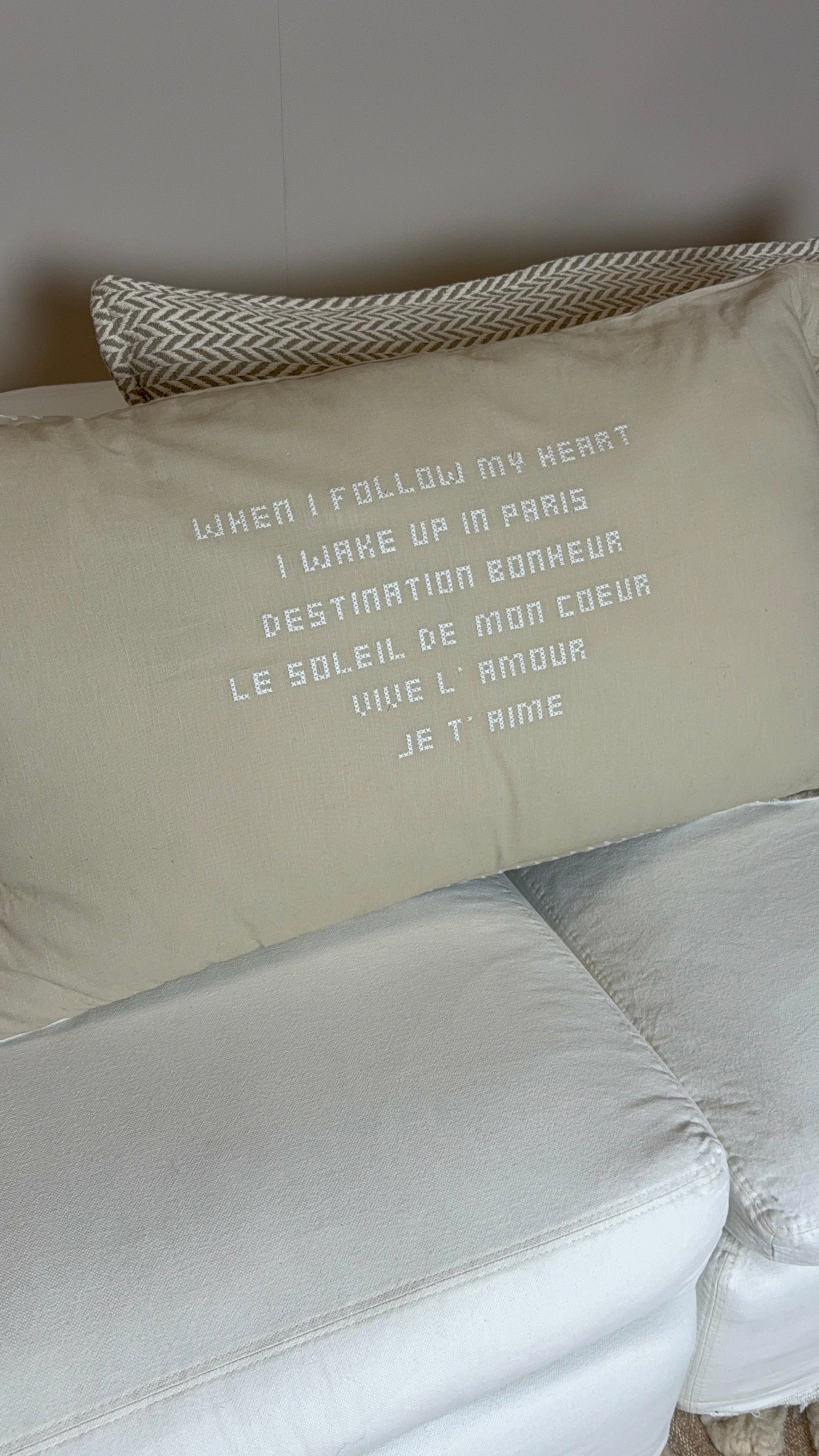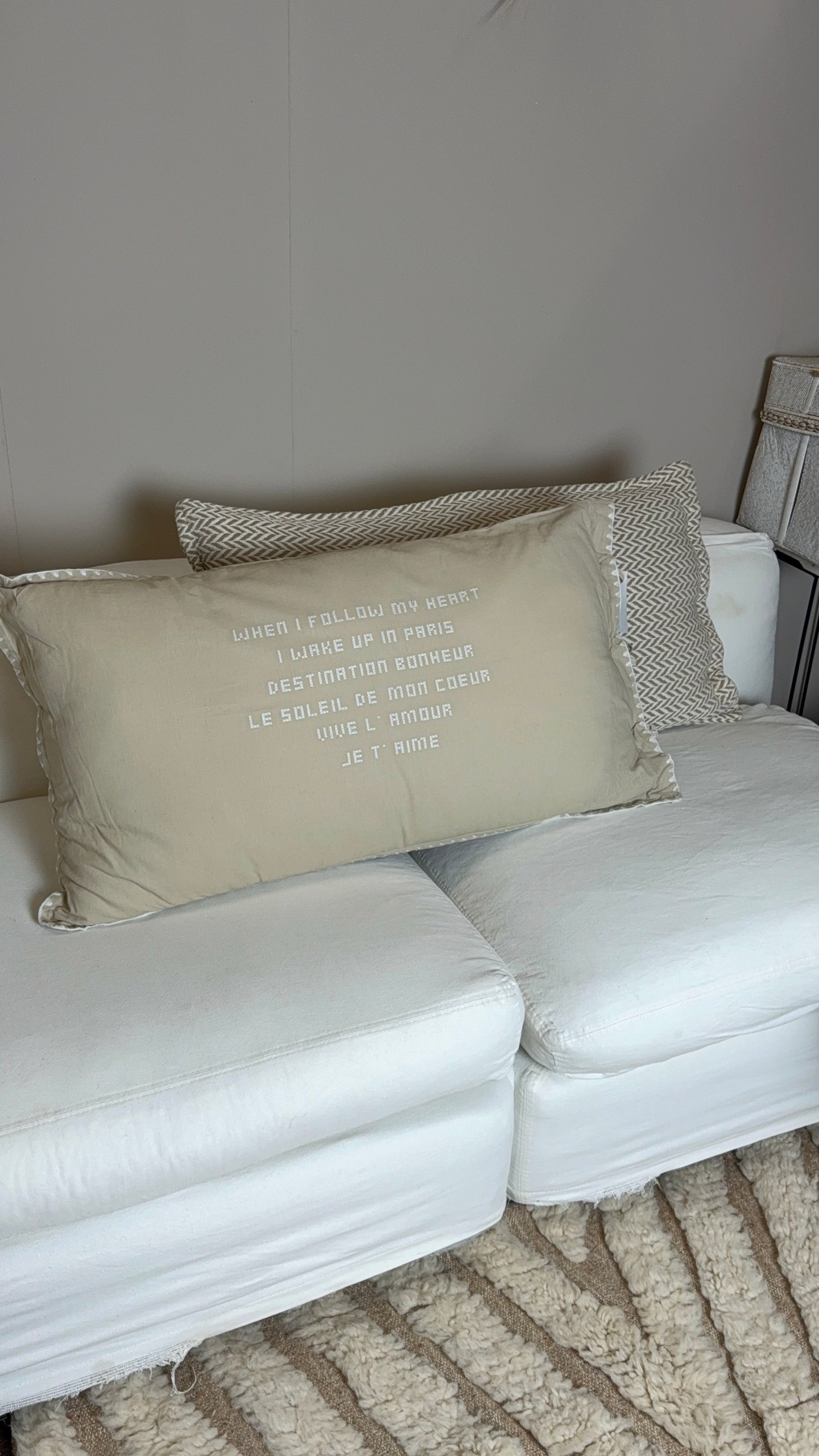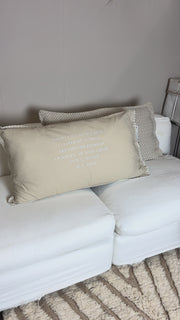 De natuurlijke stof en de subtiele tekst maken het kussen warm en persoonlijk — zonder dat het interieur druk wordt.