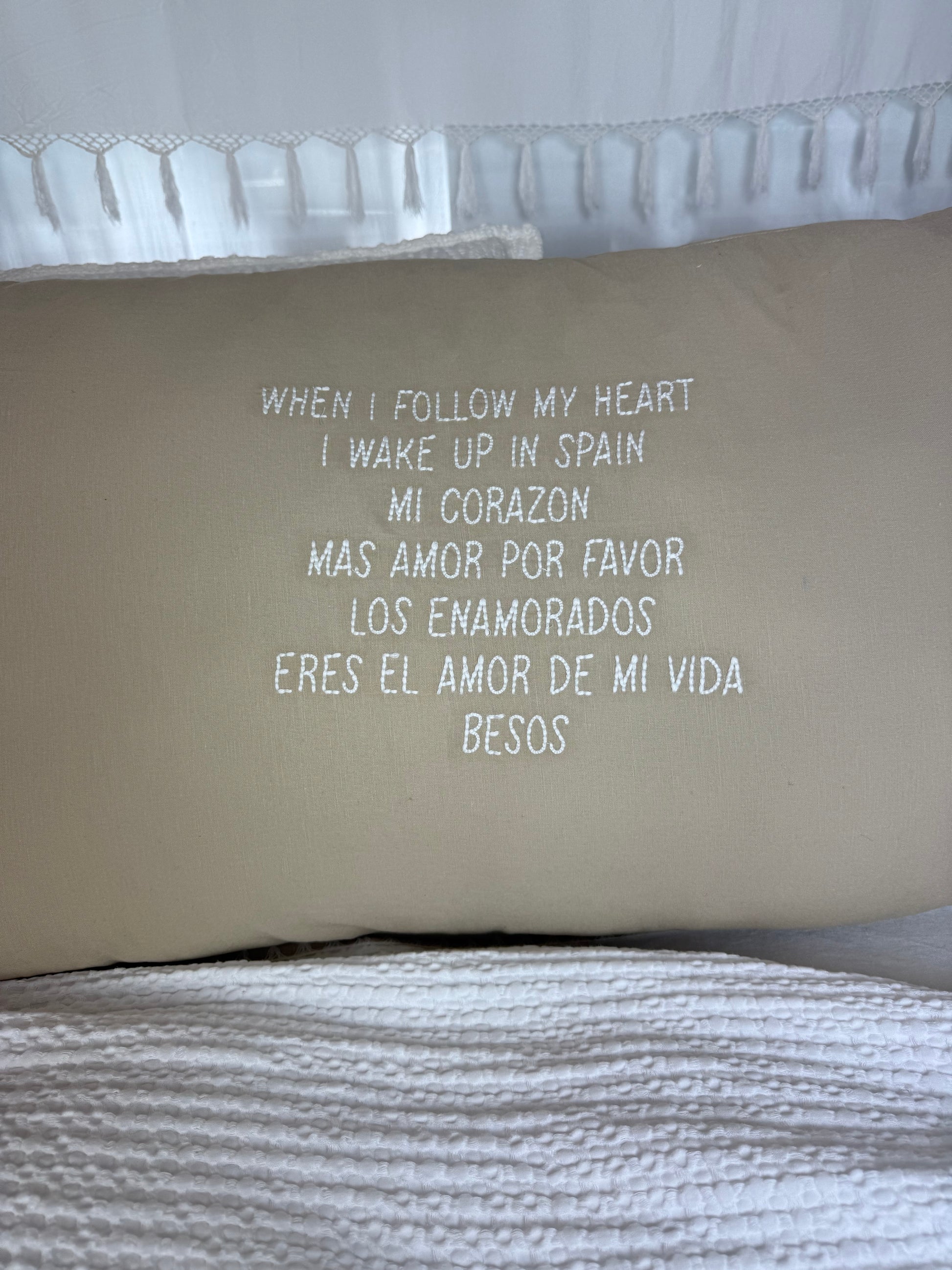Ontwaak met een bijna vakantiegevoel! Dit royale linnen kussen (90 x 50 cm) in naturel tinten is voorzien van de subtiele tekst I Wake Up In Spain , met de hand geborduurd n door vrouwelijke ambachtslieden. Perfect om sfeer en persoonlijkheid toe te voegen aan elke ruimte.