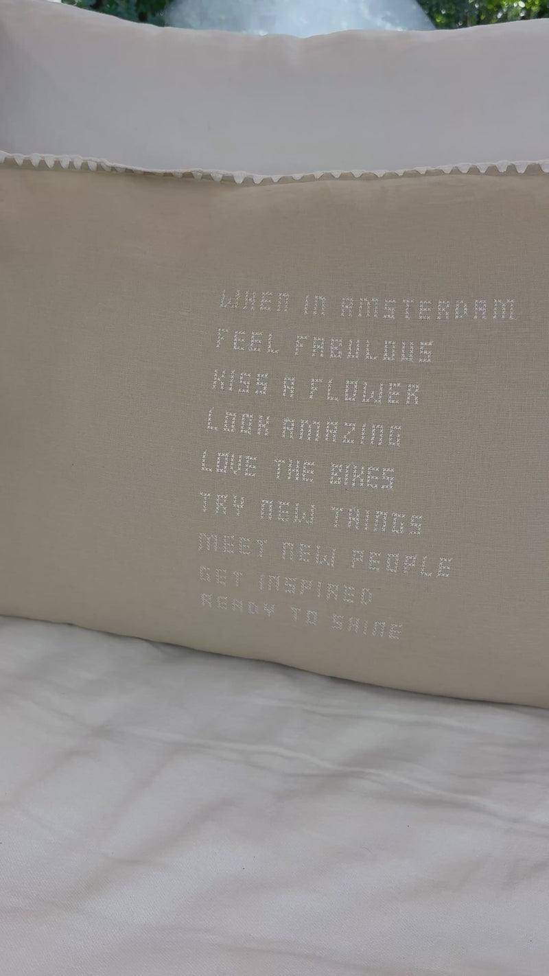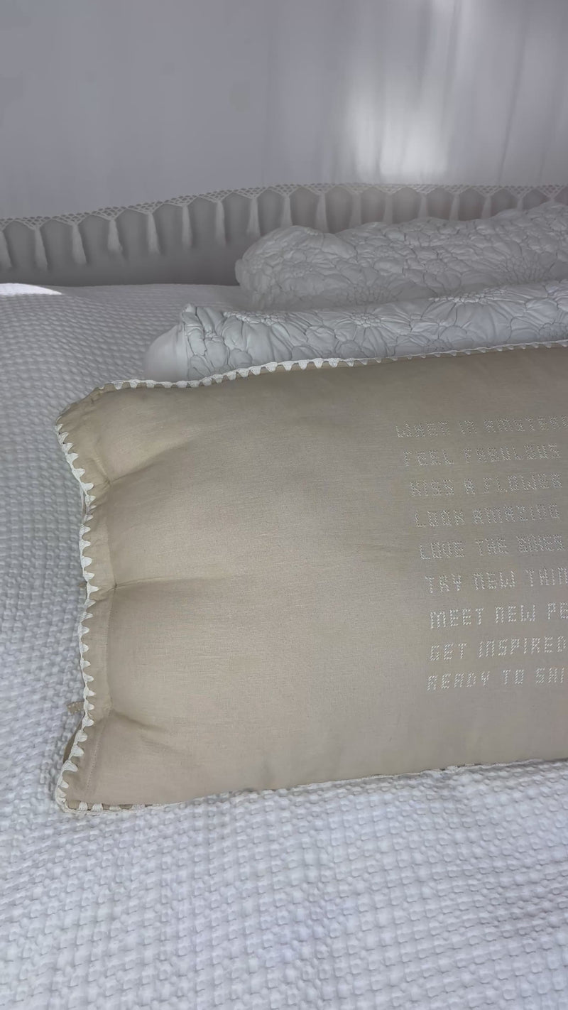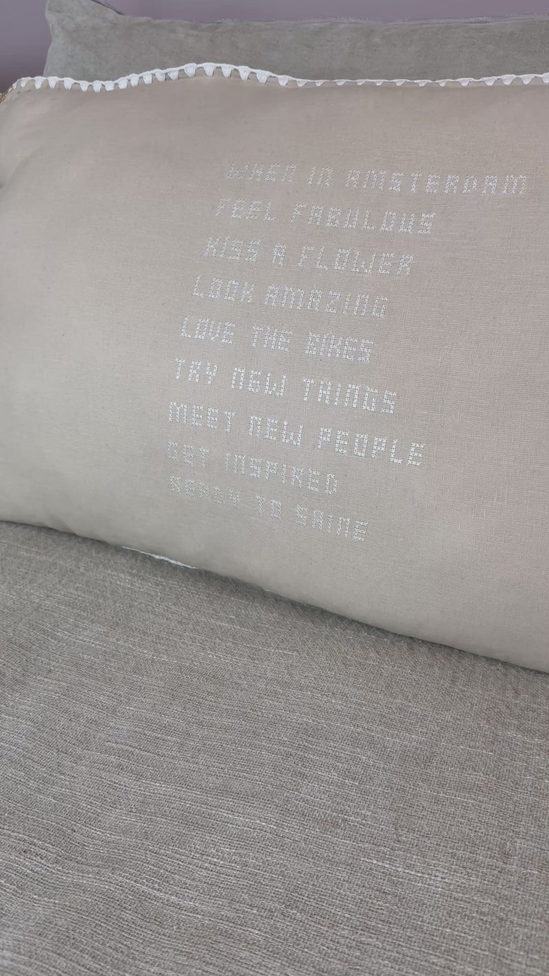 Ontdek de schoonheid van uniek vakmanschap met onze handgemaakte linnen kussens, elk een uniek exemplaar. Deze prachtige kussens, met een afmeting van maar liefst 90 x 50 cm, zijn voorzien van handgeborduurde tekst, met liefde vervaardigd door bekwame vrouwelijke ambachtslieden.