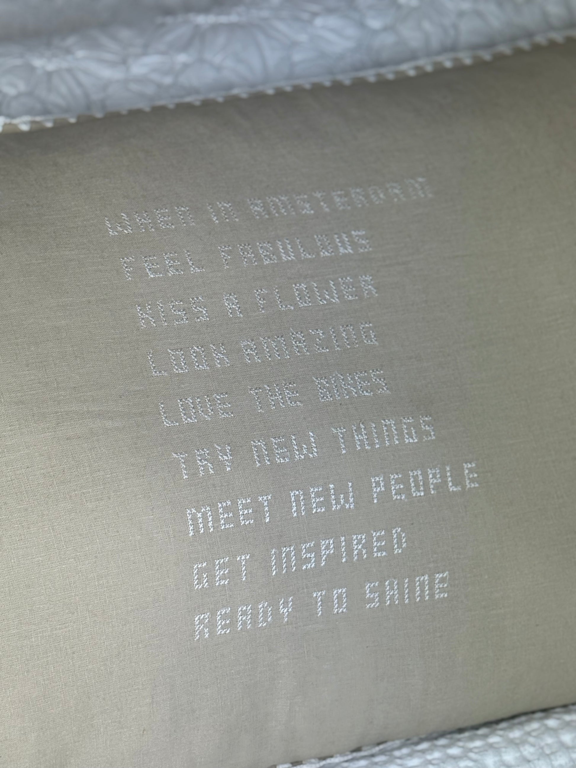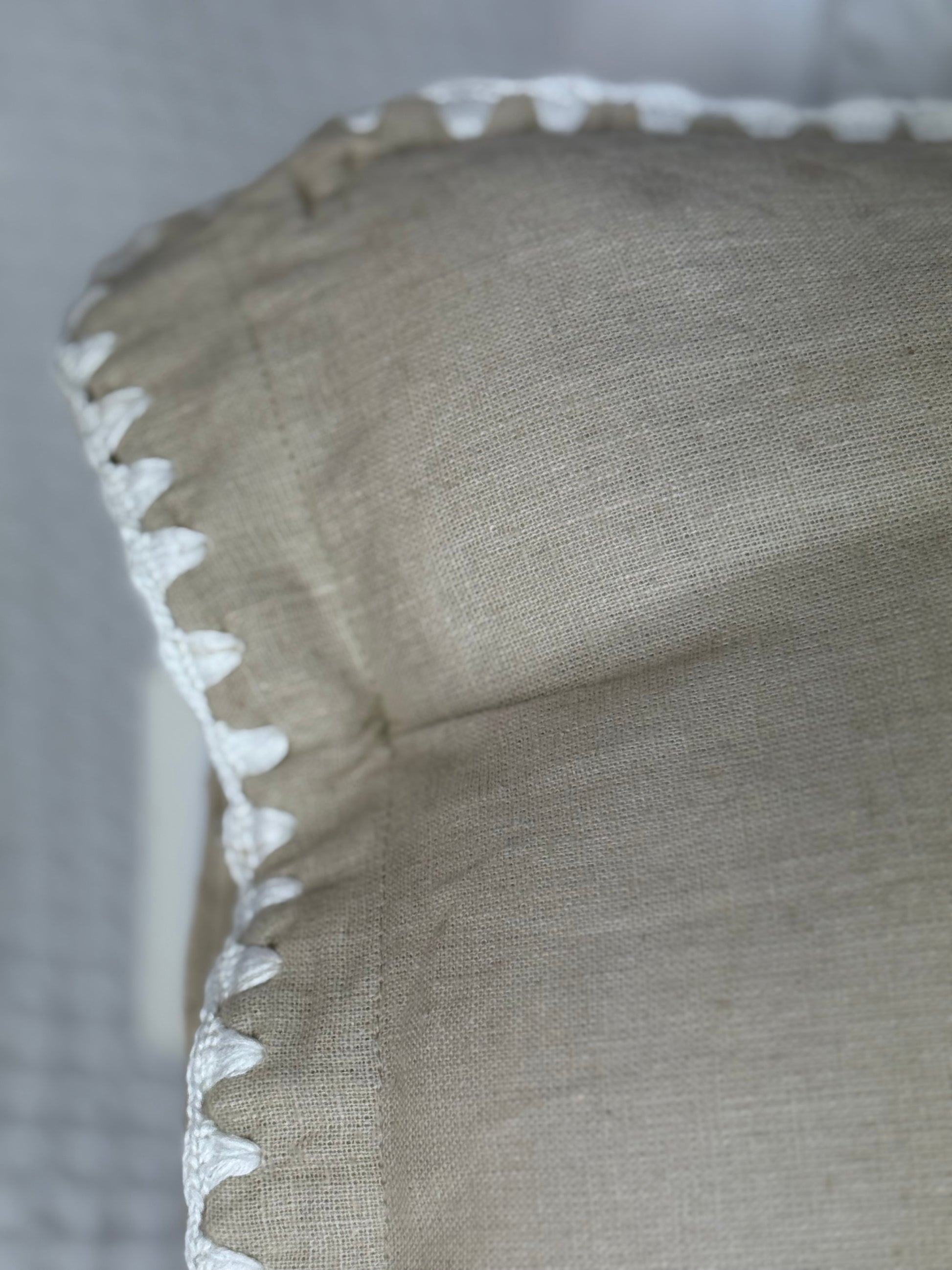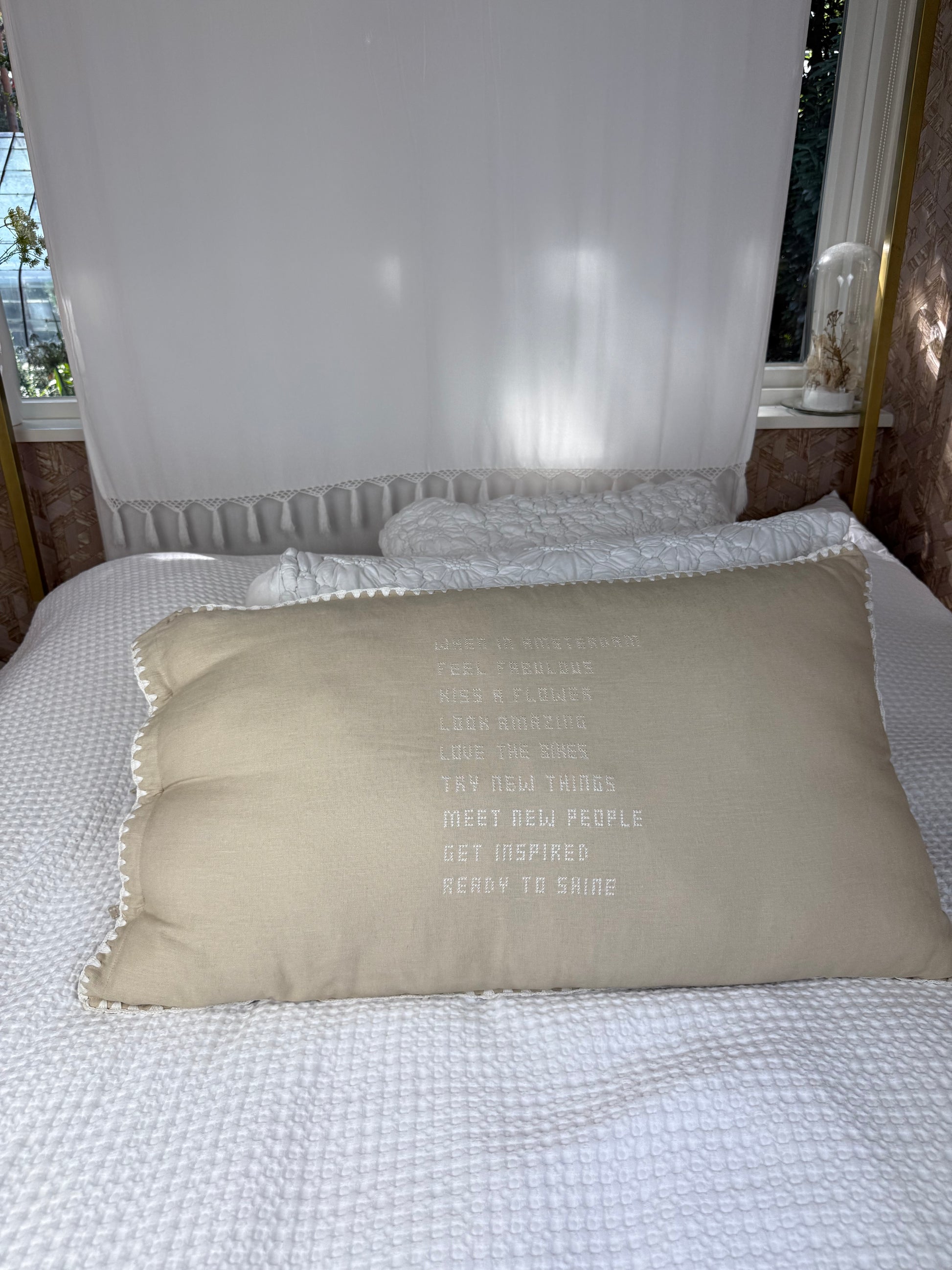 Ontdek de schoonheid van uniek vakmanschap met onze handgemaakte linnen kussens, elk een uniek exemplaar. Deze prachtige kussens, met een afmeting van maar liefst 90 x 50 cm, zijn voorzien van handgeborduurde tekst, met liefde vervaardigd door bekwame vrouwelijke ambachtslieden.