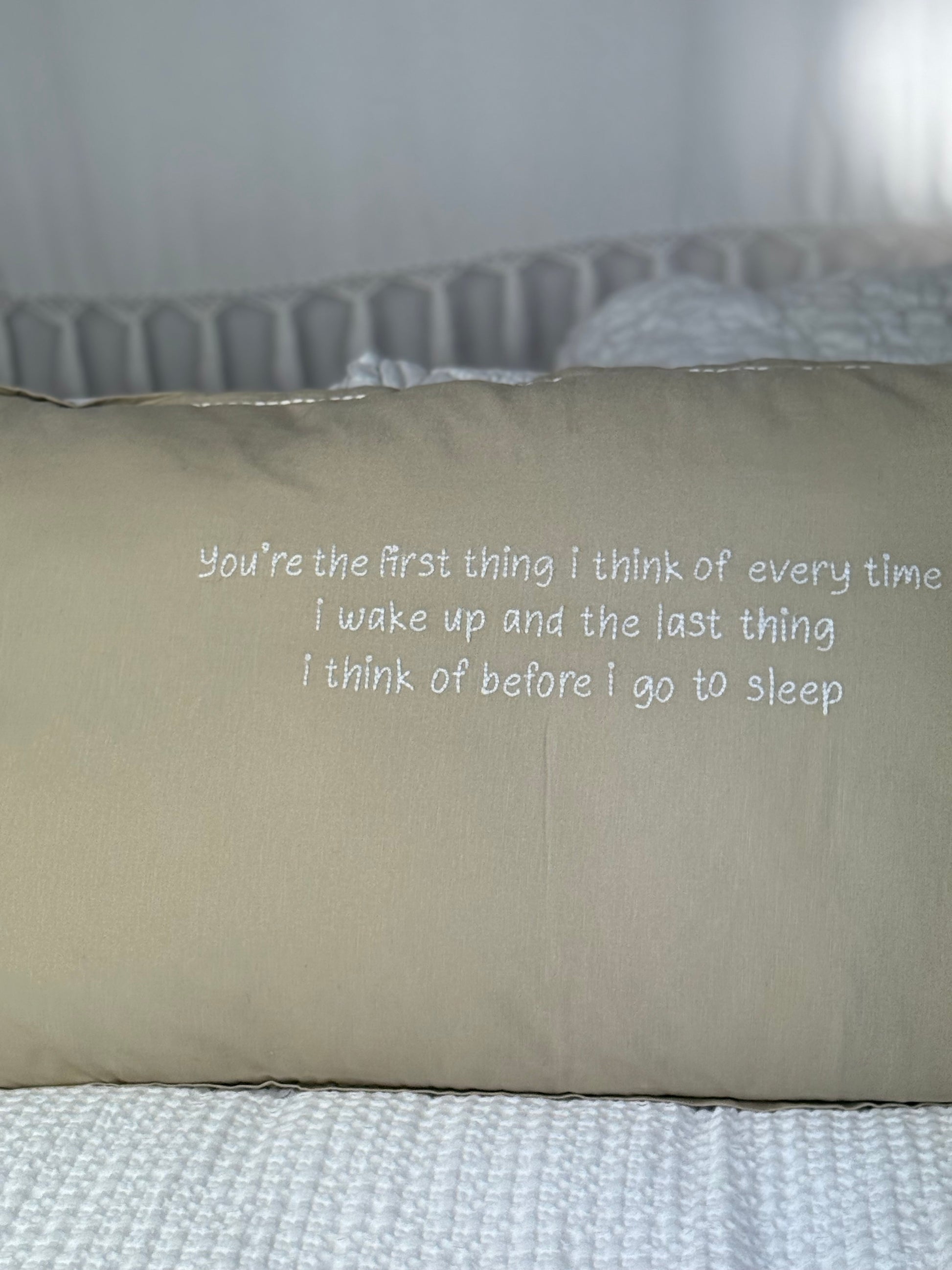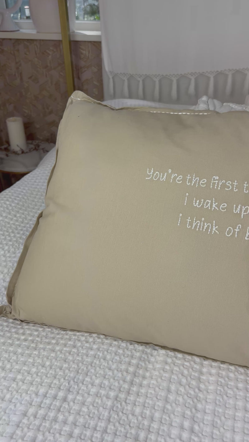 Ontdek de schoonheid van uniek vakmanschap met onze handgemaakte linnen kussens, elk een uniek exemplaar. Deze prachtige kussens, met een afmeting van maar liefst 90 x 50 cm, zijn voorzien van handgeborduurde tekst, met liefde vervaardigd door bekwame vrouwelijke ambachtslieden.
